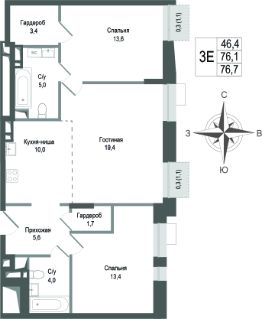 Продаётся 3-комнатная квартира в строящемся доме (Корпус 2), срок сдачи: II-кв. 2027, общей площадью 76.1 кв.м., на 4 этаже. ЖК "Киноквартал" , МО, г. Королев, мкр. Первомайский, ул. Солнечная, д. 2
