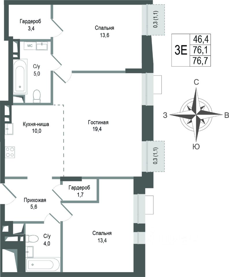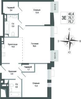 Продаётся 3-комнатная квартира в строящемся доме (Корпус 2), срок сдачи: II-кв. 2027, общей площадью 76.1 кв.м., на 6 этаже. ЖК "Киноквартал" , МО, г. Королев, мкр. Первомайский, ул. Солнечная, д. 2