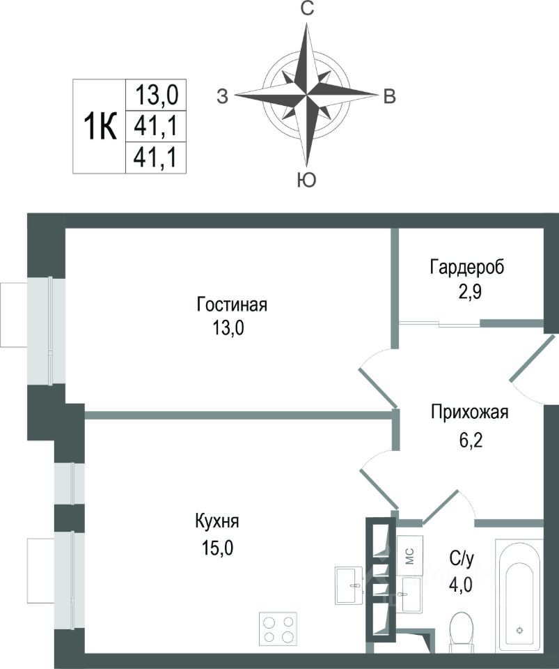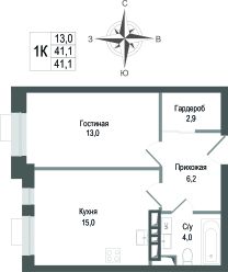 Продаётся 1-комнатная квартира в строящемся доме (Корпус 2), срок сдачи: II-кв. 2027, общей площадью 41.1 кв.м., на 3 этаже. ЖК "Киноквартал" , МО, г. Королев, мкр. Первомайский, ул. Солнечная, д. 2