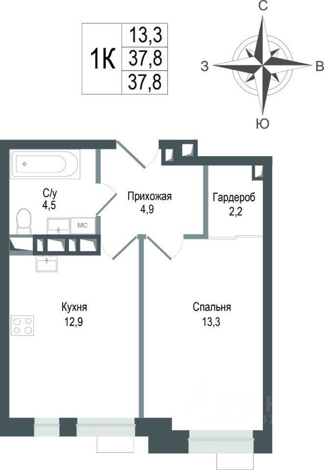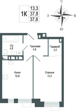 Продаётся 1-комнатная квартира в строящемся доме (Корпус 2), срок сдачи: II-кв. 2027, общей площадью 37.8 кв.м., на 3 этаже. ЖК "Киноквартал" , МО, г. Королев, мкр. Первомайский, ул. Солнечная, д. 2