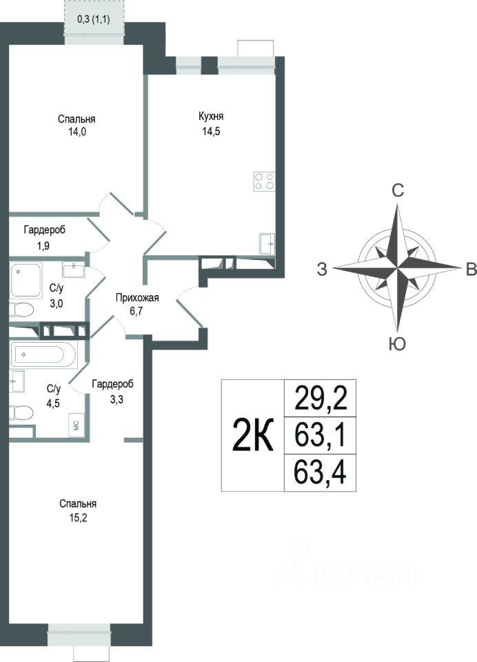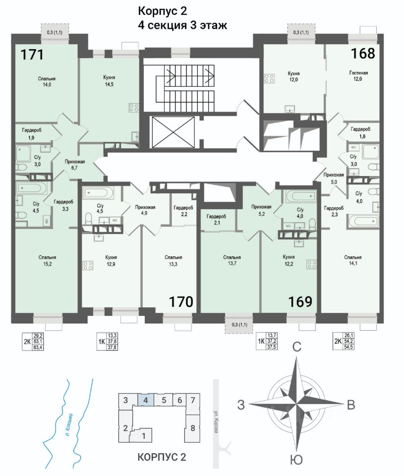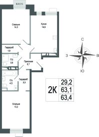 Продаётся 2-комнатная квартира в строящемся доме (Корпус 2), срок сдачи: II-кв. 2027, общей площадью 63.1 кв.м., на 3 этаже. ЖК "Киноквартал" , МО, г. Королев, мкр. Первомайский, ул. Солнечная, д. 2