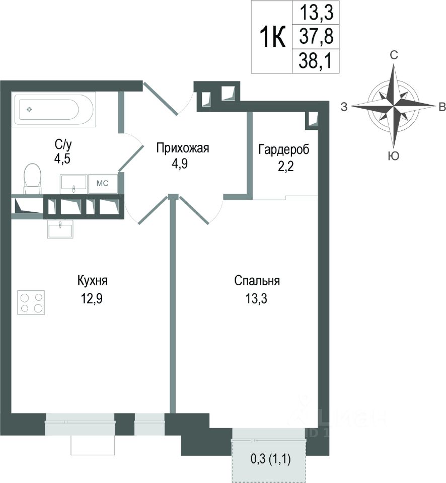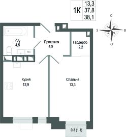 Продаётся 1-комнатная квартира в строящемся доме (Корпус 2), срок сдачи: II-кв. 2027, общей площадью 37.8 кв.м., на 6 этаже. ЖК "Киноквартал" , МО, г. Королев, мкр. Первомайский, ул. Солнечная, д. 2