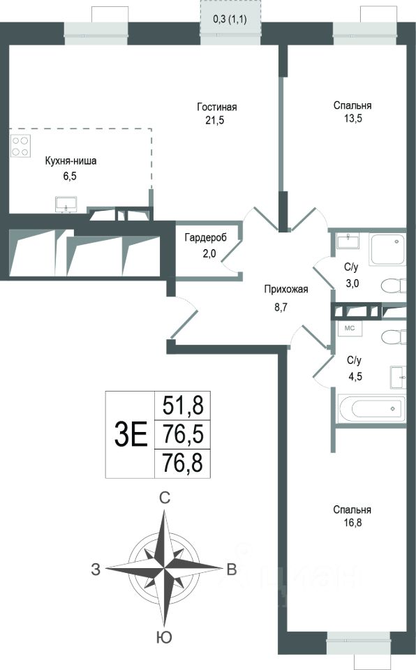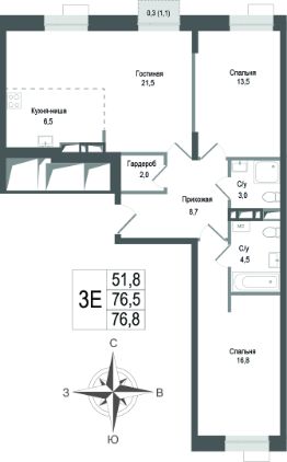 Продаётся 3-комнатная квартира в строящемся доме (Корпус 2), срок сдачи: II-кв. 2027, общей площадью 76.5 кв.м., на 3 этаже. ЖК "Киноквартал" , МО, г. Королев, мкр. Первомайский, ул. Солнечная, д. 2
