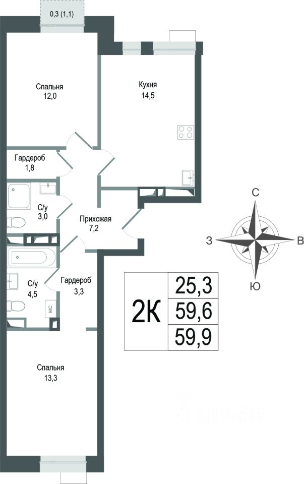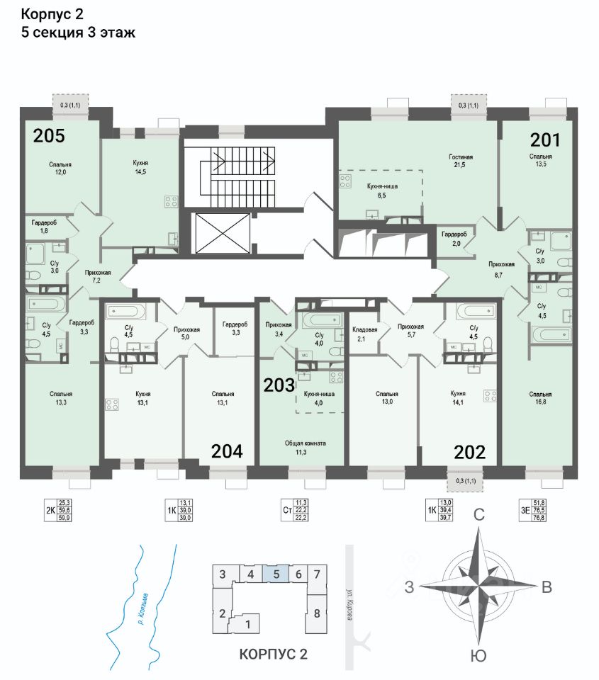 Продаётся 2-комнатная квартира в строящемся доме (Корпус 2), срок сдачи: II-кв. 2027, общей площадью 59.6 кв.м., на 3 этаже. ЖК "Киноквартал" , МО, г. Королев, мкр. Первомайский, ул. Солнечная, д. 2