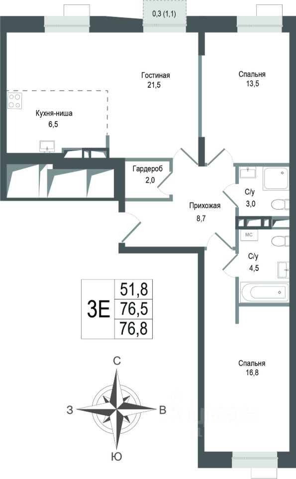 Продаётся 3-комнатная квартира в строящемся доме (Корпус 2), срок сдачи: II-кв. 2027, общей площадью 76.5 кв.м., на 5 этаже. ЖК "Киноквартал" , МО, г. Королев, мкр. Первомайский, ул. Солнечная, д. 2