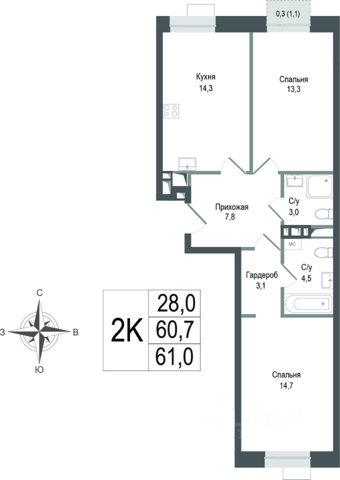 60,7 м²