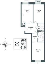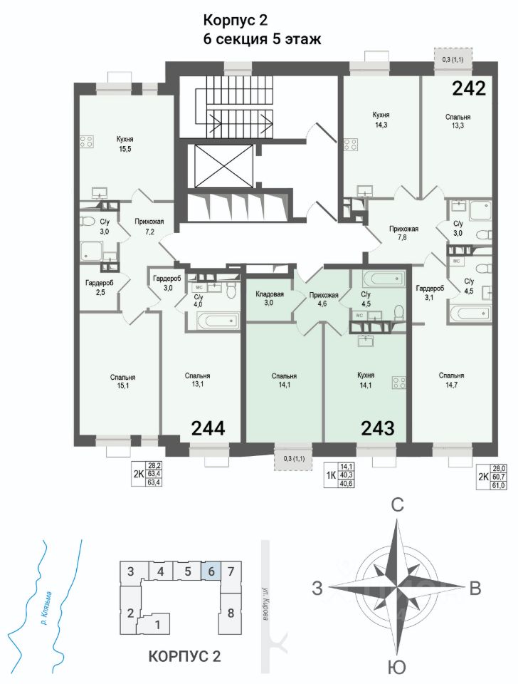 Продаётся 2-комнатная квартира в строящемся доме (Корпус 2), срок сдачи: II-кв. 2027, общей площадью 60.7 кв.м., на 5 этаже. ЖК "Киноквартал" , МО, г. Королев, мкр. Первомайский, ул. Солнечная, д. 2