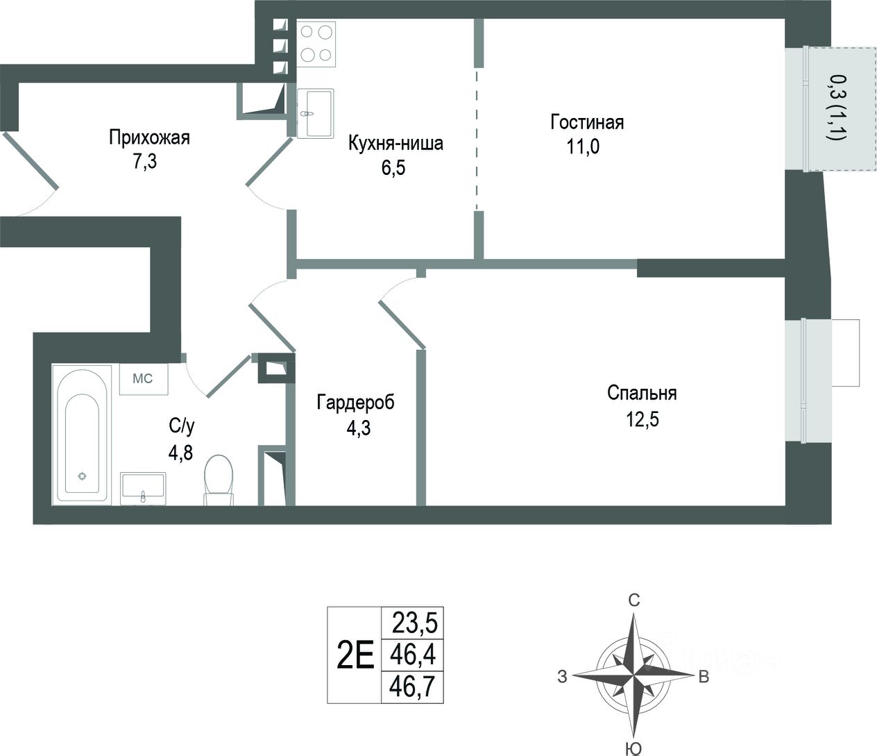 46,4 м²
