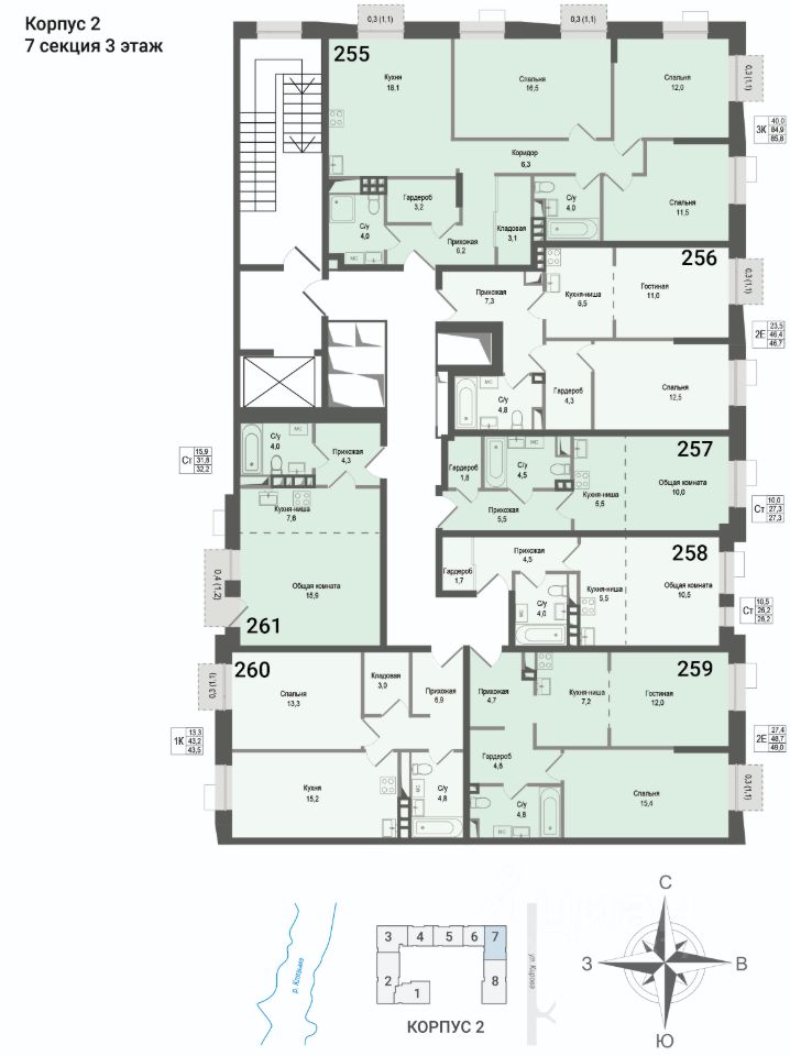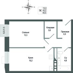 Продаётся 1-комнатная квартира в строящемся доме (Корпус 2), срок сдачи: II-кв. 2027, общей площадью 43.2 кв.м., на 3 этаже. ЖК "Киноквартал" , МО, г. Королев, мкр. Первомайский, ул. Солнечная, д. 2