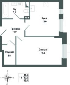 Продаётся 1-комнатная квартира в строящемся доме (Корпус 2), срок сдачи: II-кв. 2027, общей площадью 42.5 кв.м., на 3 этаже. ЖК "Киноквартал" , МО, г. Королев, мкр. Первомайский, ул. Солнечная, д. 2