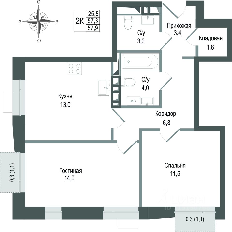 57,3 м²