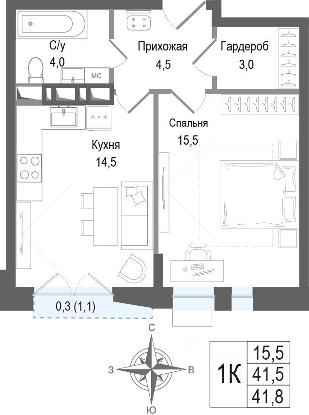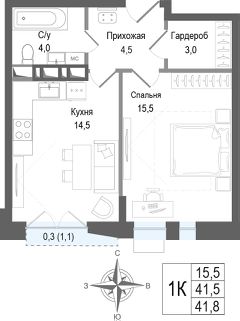 Продается 1-комнатная квартира 18 в строящемся ЖК "КИНОКВАРТАЛ", Корпус 1. Квартира расположена на 4 этаже, общая площадь 41,3 кв.м.