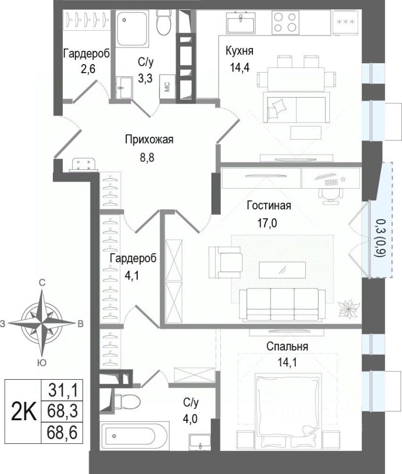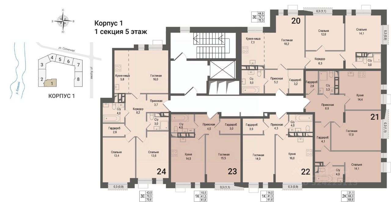 Продается 2-комнатная квартира 21 в строящемся ЖК "КИНОКВАРТАЛ", Корпус 1. Квартира расположена на 5 этаже, общая площадь 68,3 кв.м.