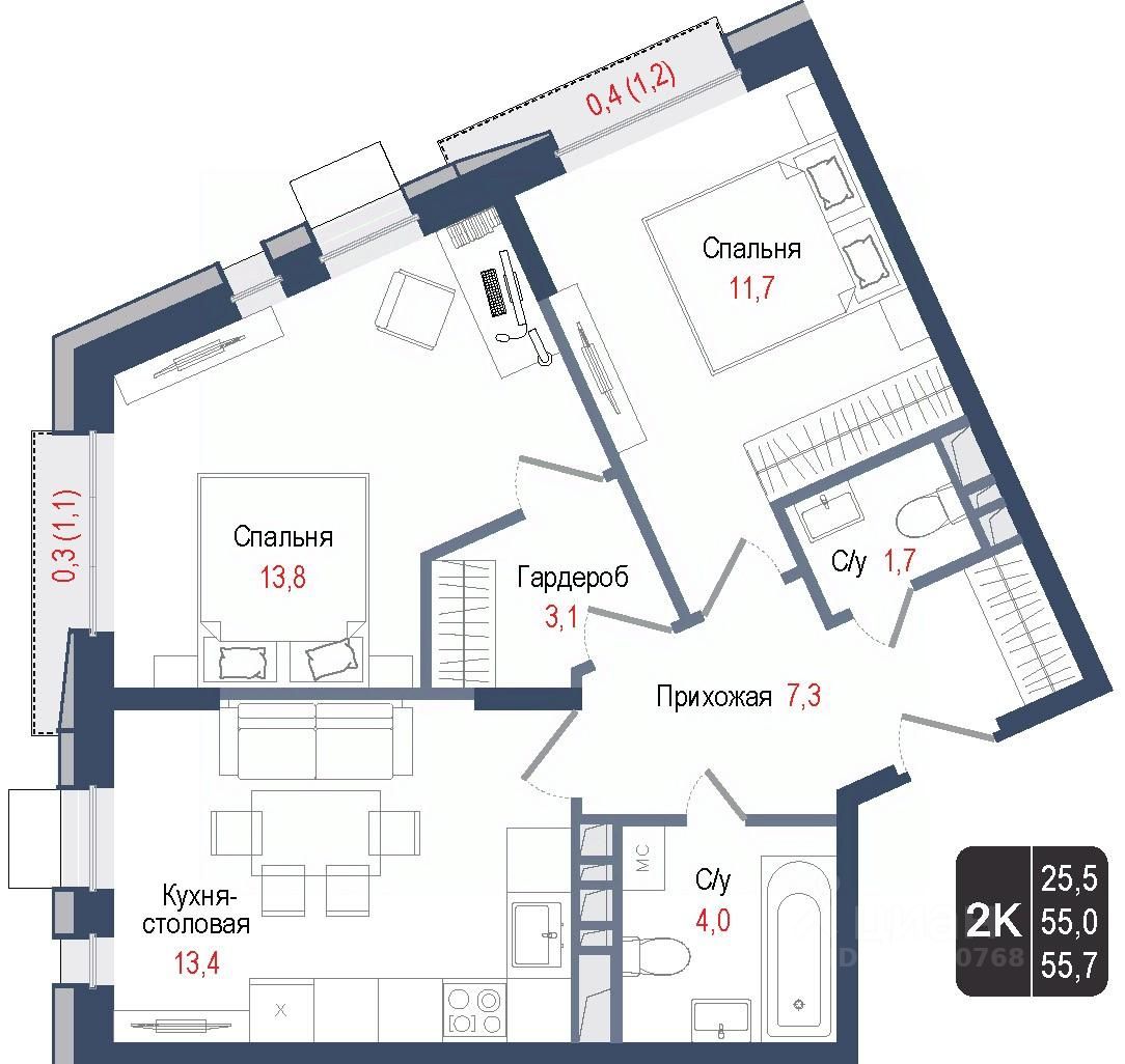 Продается 2-комнатная квартира 153 в строящемся ЖК "КИНОКВАРТАЛ", Корпус 1. Квартира расположена на 5 этаже, общая площадь 55 кв.м.