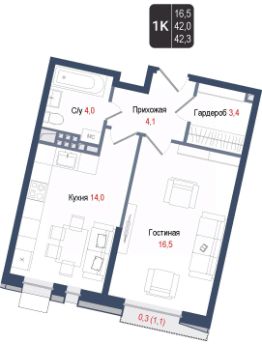 Продается 1-комнатная квартира 187 в строящемся ЖК "КИНОКВАРТАЛ", Корпус 1. Квартира расположена на 3 этаже, общая площадь 42 кв.м.