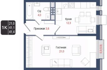 Продается 1-комнатная квартира 221 в строящемся ЖК "КИНОКВАРТАЛ", Корпус 1. Квартира расположена на 2 этаже, общая площадь 41,1 кв.м.