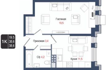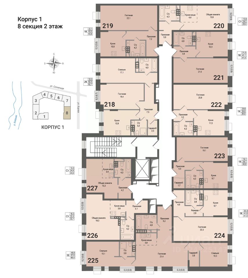 Продается 1-комнатная квартира 222 в строящемся ЖК "КИНОКВАРТАЛ", Корпус 1. Квартира расположена на 2 этаже, общая площадь 38,6 кв.м.