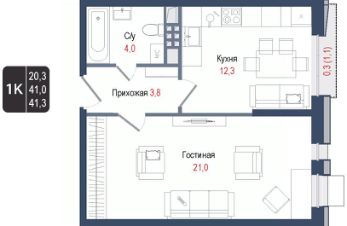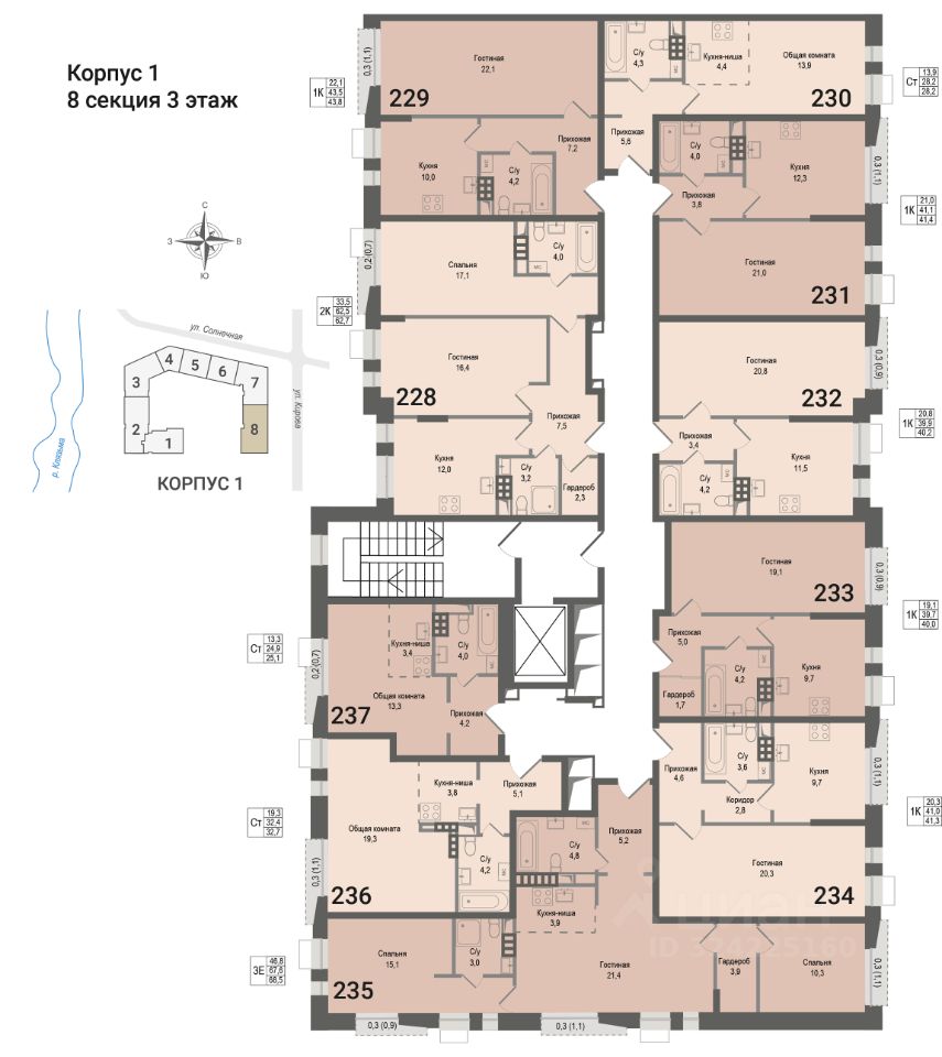 Продается 1-комнатная квартира 231 в строящемся ЖК "КИНОКВАРТАЛ", Корпус 1. Квартира расположена на 3 этаже, общая площадь 41,1 кв.м.