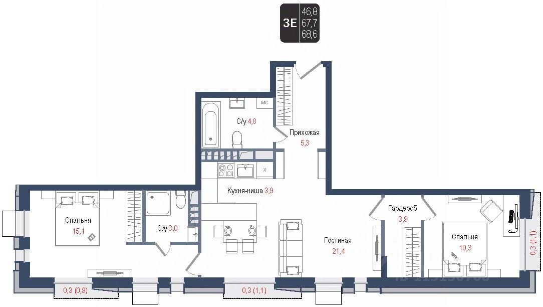 Продается 3-комнатная квартира 235 в строящемся ЖК "КИНОКВАРТАЛ", Корпус 1. Квартира расположена на 3 этаже, общая площадь 67,7 кв.м.