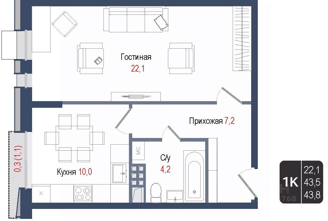 Продается 1-комнатная квартира 239 в строящемся ЖК "КИНОКВАРТАЛ", Корпус 1. Квартира расположена на 4 этаже, общая площадь 43,5 кв.м.