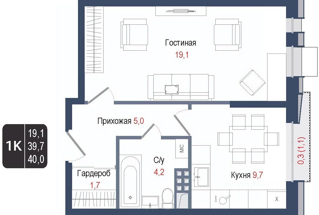 Продается 1-комнатная квартира 243 в строящемся ЖК "КИНОКВАРТАЛ", Корпус 1. Квартира расположена на 4 этаже, общая площадь 39,7 кв.м.