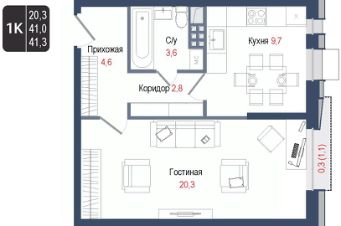 Продается 1-комнатная квартира 244 в строящемся ЖК "КИНОКВАРТАЛ", Корпус 1. Квартира расположена на 4 этаже, общая площадь 41 кв.м.