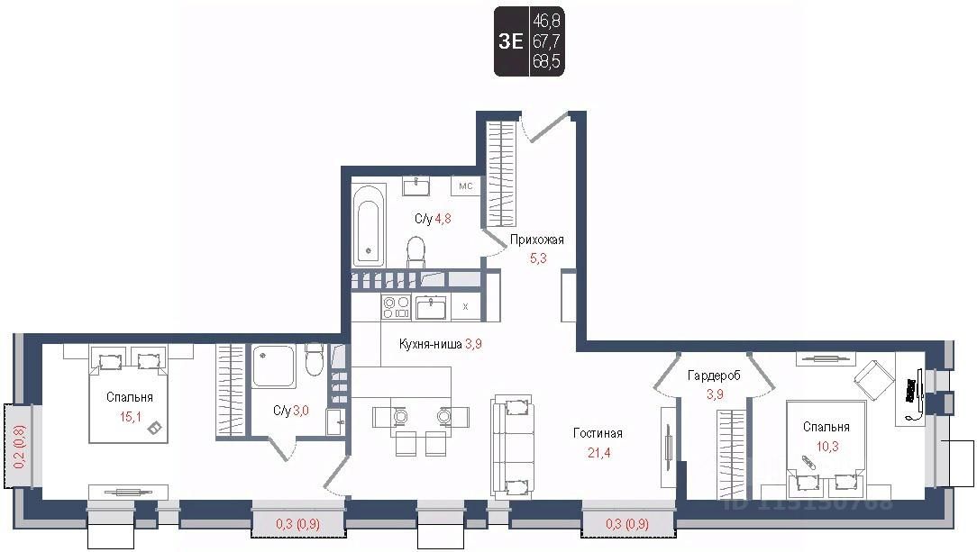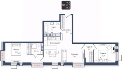 Продается 3-комнатная квартира 245 в строящемся ЖК "КИНОКВАРТАЛ", Корпус 1. Квартира расположена на 4 этаже, общая площадь 67,7 кв.м.