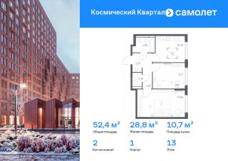 Строим кварталы для жизни с заботой о будущем. Предлагается 2-комнатная квартира комфорт-класса 52,39 кв.м в корпусе 1 на 13 этаже, в ЖК "Космический Квартал"