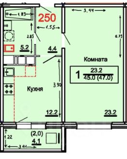 Просторная кухня 12.2 кв.м. с выходом на застекленную большую лоджию, просторная комната 23,2 кв.м., большой правильной формы совмещенный санузел 5,2 кв.м.
