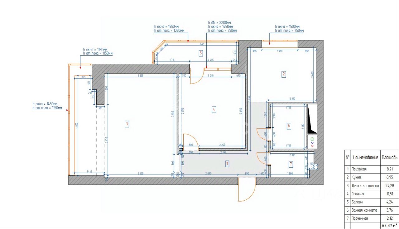 Общая площадь 63,35 метра, изолированные комнаты: 15 и 18 метров, просторная кухня - 12 метров, совмещенный санузел, застекленный балкон.