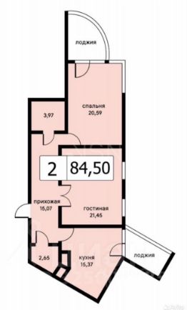 * **Идеальные пропорции:** Большая кухня-гостиная (15.4 м²), две изолированные светлые комнаты (20.6 и 21.5 м²), два санузла и целых две лоджии.