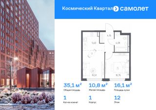 Строим кварталы для жизни с заботой о будущем. Предлагается 1-комнатная квартира комфорт-класса 35,14 кв.м в корпусе 1 на 12 этаже, в ЖК "Космический Квартал"