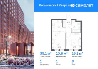 Строим кварталы для жизни с заботой о будущем. Предлагается 1-комнатная квартира комфорт-класса 35,14 кв.м в корпусе 1 на 8 этаже, в ЖК "Космический Квартал"