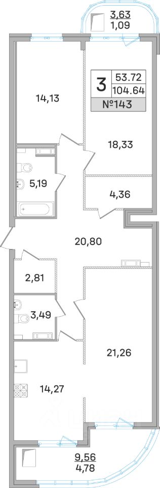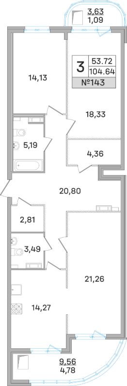 Продаётся 3 - комнатная квартира в готовом доме (Калинина, 11), срок сдачи: Дом сдан, общей площадью 104.60 кв.м., на 18 этаже.