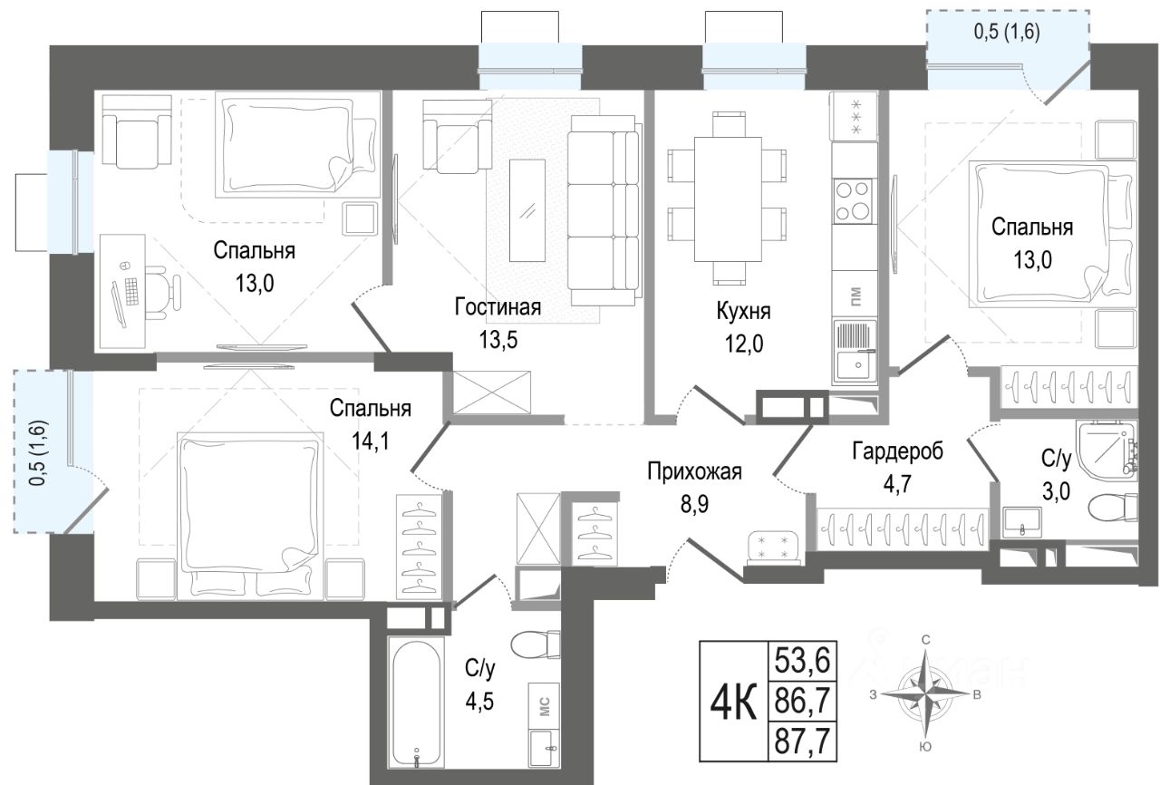 86,7 м²