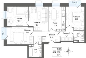 Продаётся 4-комнатная квартира в строящемся доме (Корпус 3), срок сдачи: II-кв. 2028, общей площадью 86.7 кв.м., на 3 этаже. ЖК "Киноквартал" , МО, г. Королев, мкр. Первомайский, ул. Солнечная, д. 2