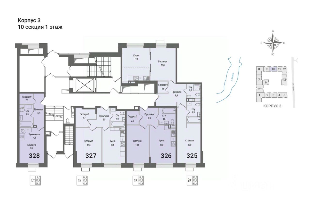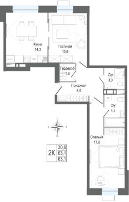 Продаётся 2-комнатная квартира в строящемся доме (Корпус 3), срок сдачи: II-кв. 2028, общей площадью 63.1 кв.м., на 1 этаже. ЖК "Киноквартал" , МО, г. Королев, мкр. Первомайский, ул. Солнечная, д. 2