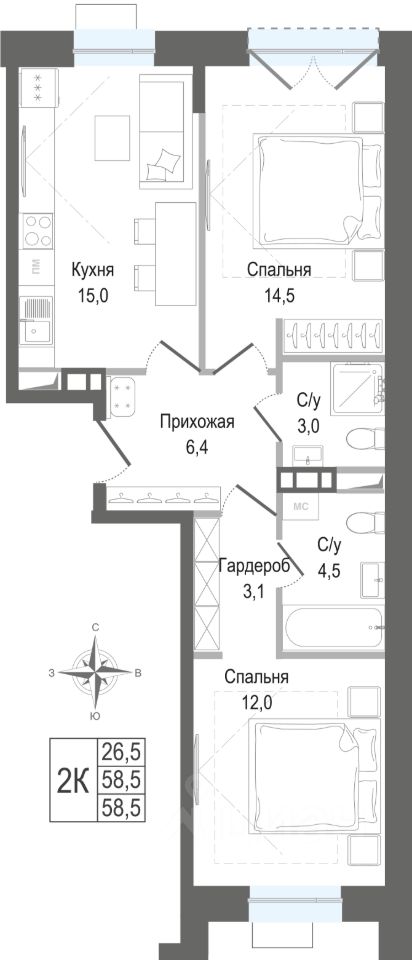 Продаётся 2-комнатная квартира в строящемся доме (Корпус 3), срок сдачи: II-кв. 2028, общей площадью 58.5 кв.м., на 1 этаже. ЖК "Киноквартал" , МО, г. Королев, мкр. Первомайский, ул. Солнечная, д. 2