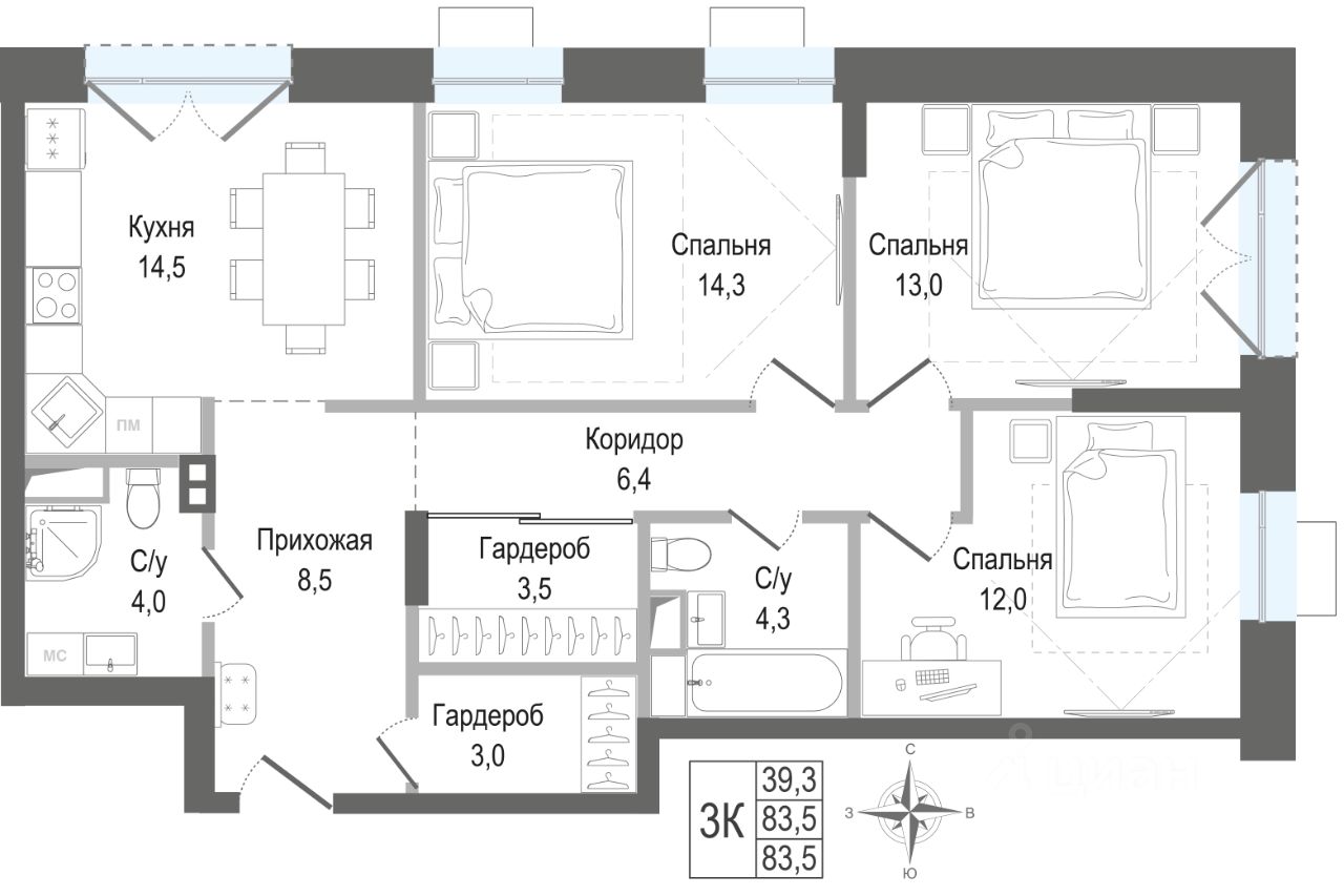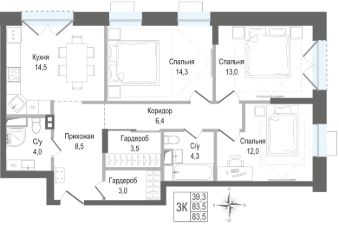Продаётся 3-комнатная квартира в строящемся доме (Корпус 3), срок сдачи: II-кв. 2028, общей площадью 83.5 кв.м., на 2 этаже. ЖК "Киноквартал" , МО, г. Королев, мкр. Первомайский, ул. Солнечная, д. 2