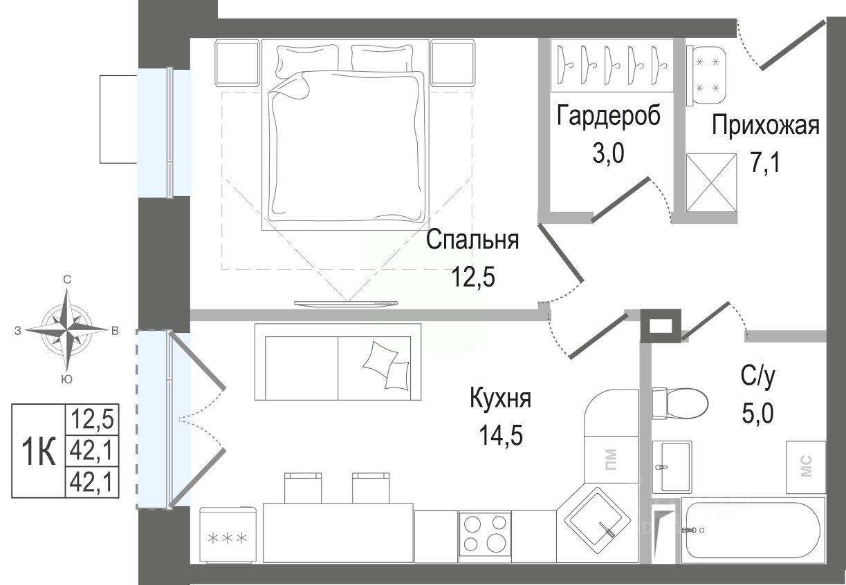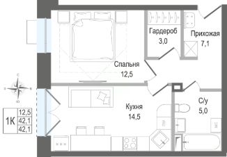 Продаётся 1-комнатная квартира в строящемся доме (Корпус 3), срок сдачи: II-кв. 2028, общей площадью 42.1 кв.м., на 2 этаже. ЖК "Киноквартал" , МО, г. Королев, мкр. Первомайский, ул. Солнечная, д. 2