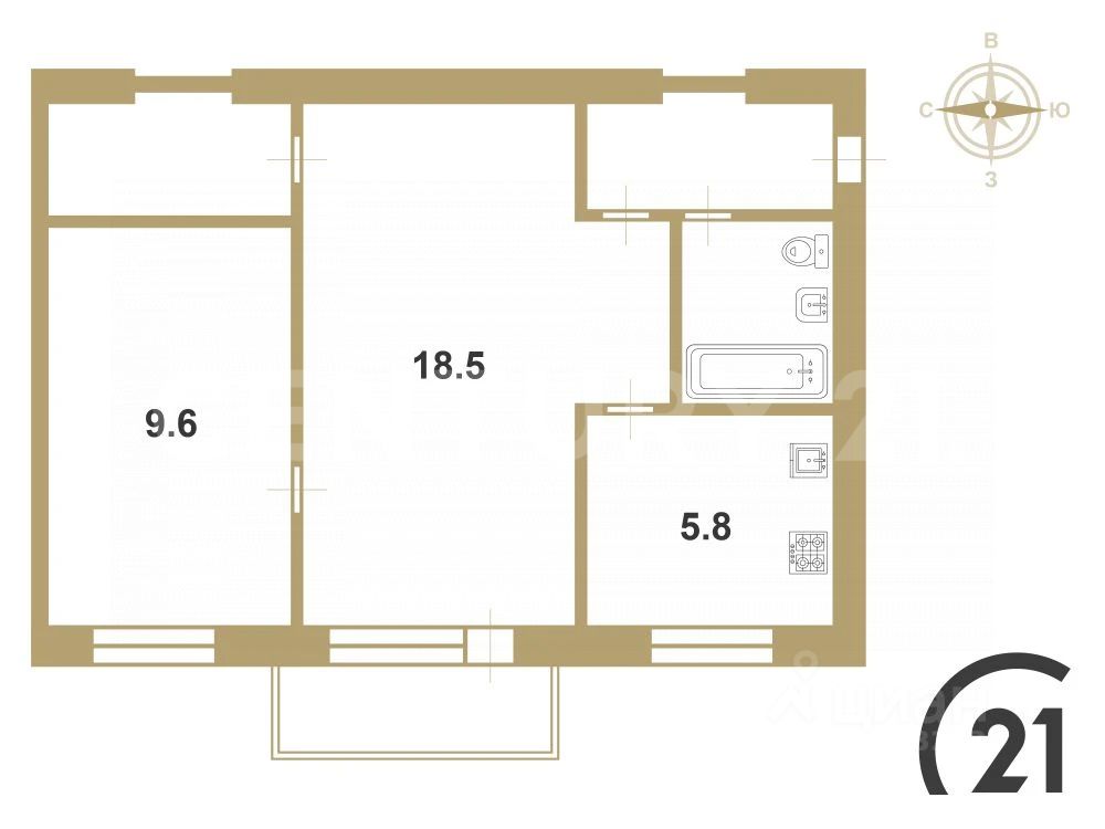 Площадь 43 м², две смежные комнаты (18,5 + 9,6 м²), кухня 5,8 м², совместный санузел.