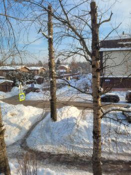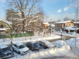 В квартире две изолированные комнаты 9.7+17.8 кв.м, большая кухня 10 кв.м, раздельный санузел, застекленная лоджия. Отличная планировка: квартира угловая, с соседями по этажу стыкуется только одной стеной. Окна выходят на две стороны дома - гостиная угловая и просторная. Значимым критерием выбора был этаж - не первый и не последний, чтобы не было огромных бесполезных коридоров и не было напротив окон других домов. Окна выходят на частный сектор, огромный старый дуб, аллею и торец другого дома без окон.