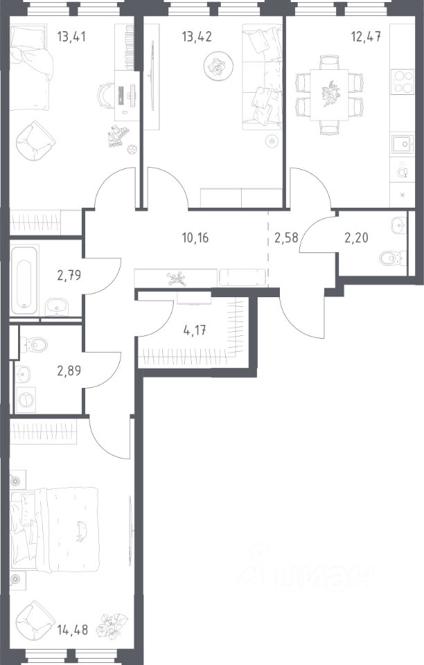 Продуманные планировки от небольших студий до просторных 4-комнатных квартир с гардеробной, постирочной и гостевым санузлом. Отделка на выбор: готовая, White Box или вариант без неё.