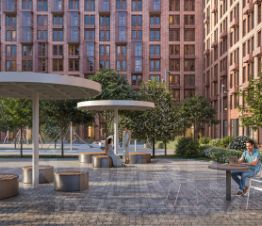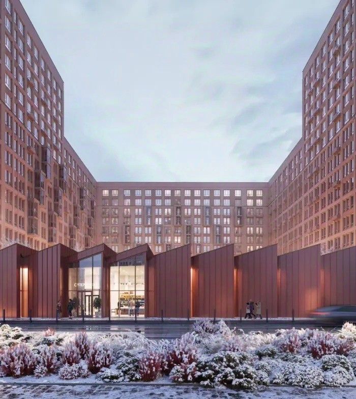 Архитектура — с характером: фасады в цветах Марса, Сатурна и Луны, дворы с космической тематикой, лаунж-зоны и площадки с ярким покрытием. Входные группы оформляет художник футуристичными панно