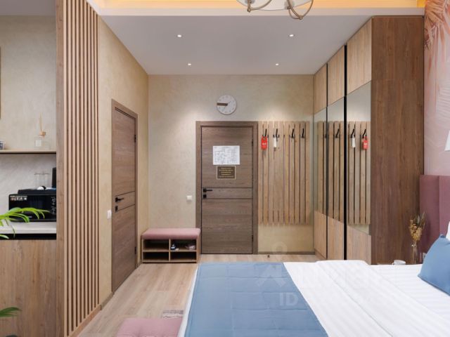 Номер-студия без кухни, с санузлом. В номере: двуспальная кровать с ортопедическим матрасом, прикроватные тумбы, телевизор, шкаф для одежды, стол и стулья.